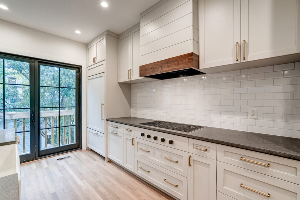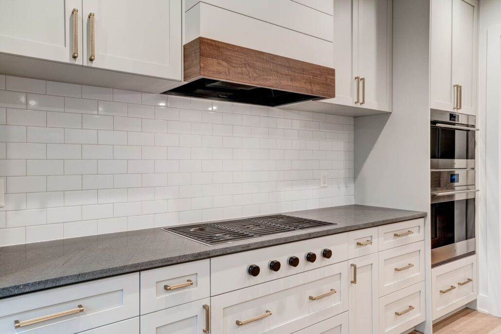 The use of shiplap and stained wood features that add warmth and a modern rustic touch to the kitchen.
