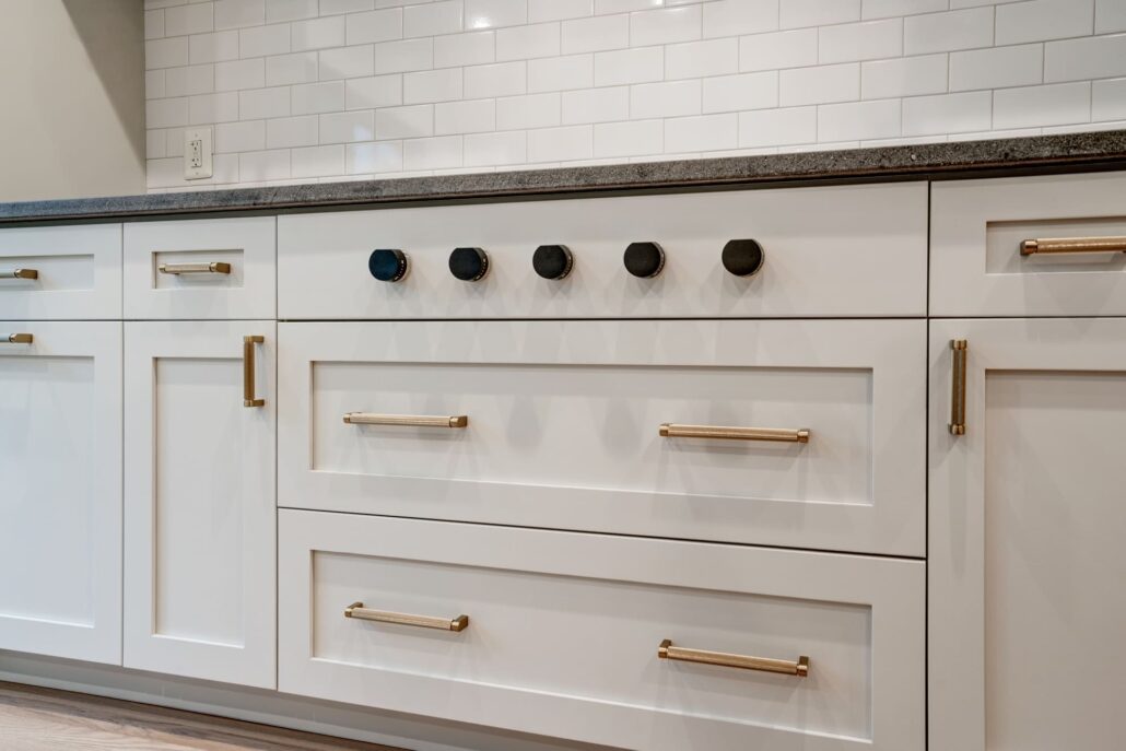 Detailed exploration of the transitional cabinetry paired with industrial hardware and high-end appliances for a sleek, functional kitchen.