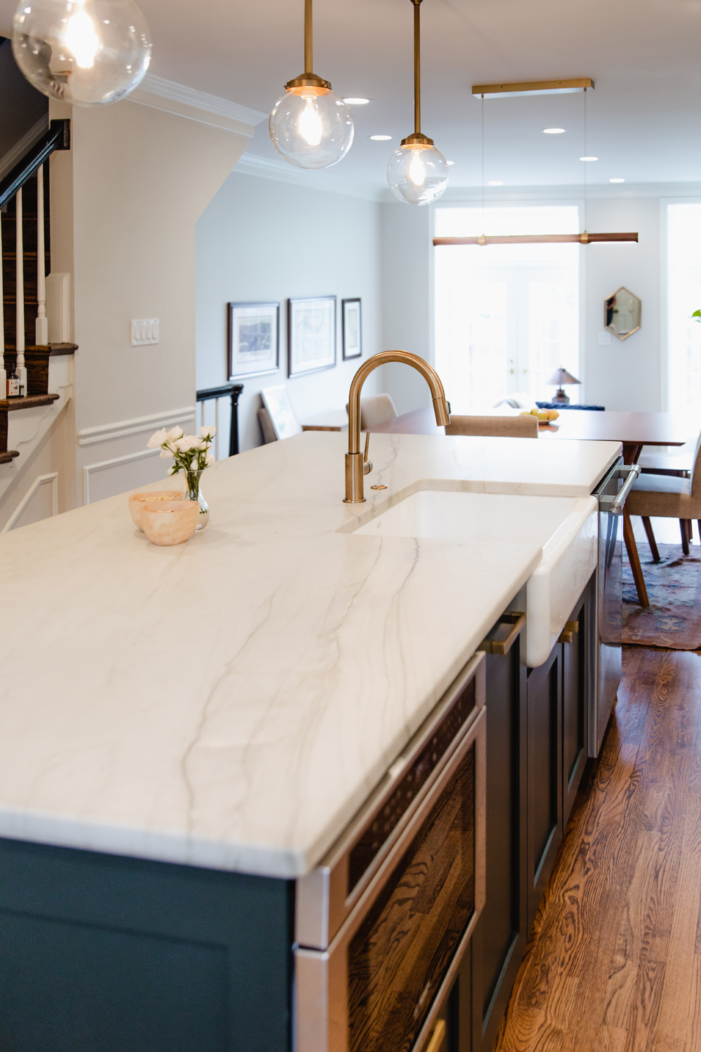 This open concept kitchen beautifully flows into the dining room with wood bench seating and custom cabinetry storage at the dining room with floating wood shelving. All golden metal accents, kitchen hardware, kitchen faucet and golden lighting fixtures were the stunning finishing features that brought this modern kitchen design together.